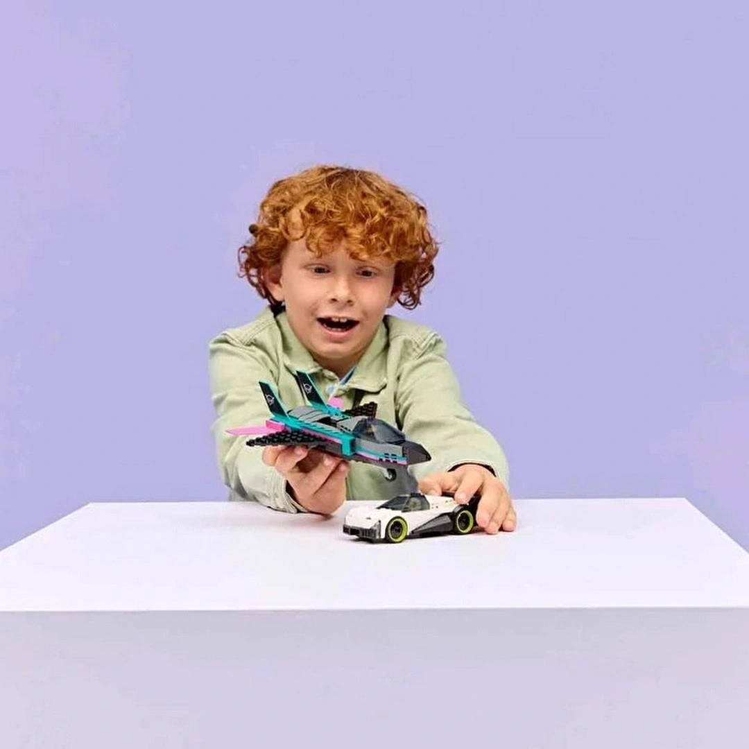 İki özellik birden sunan LEGO City Jet, Arabaya Karşı (60489) araç oyuncağı seti; yaratıcı yarış eğlencesi için şık süper araba