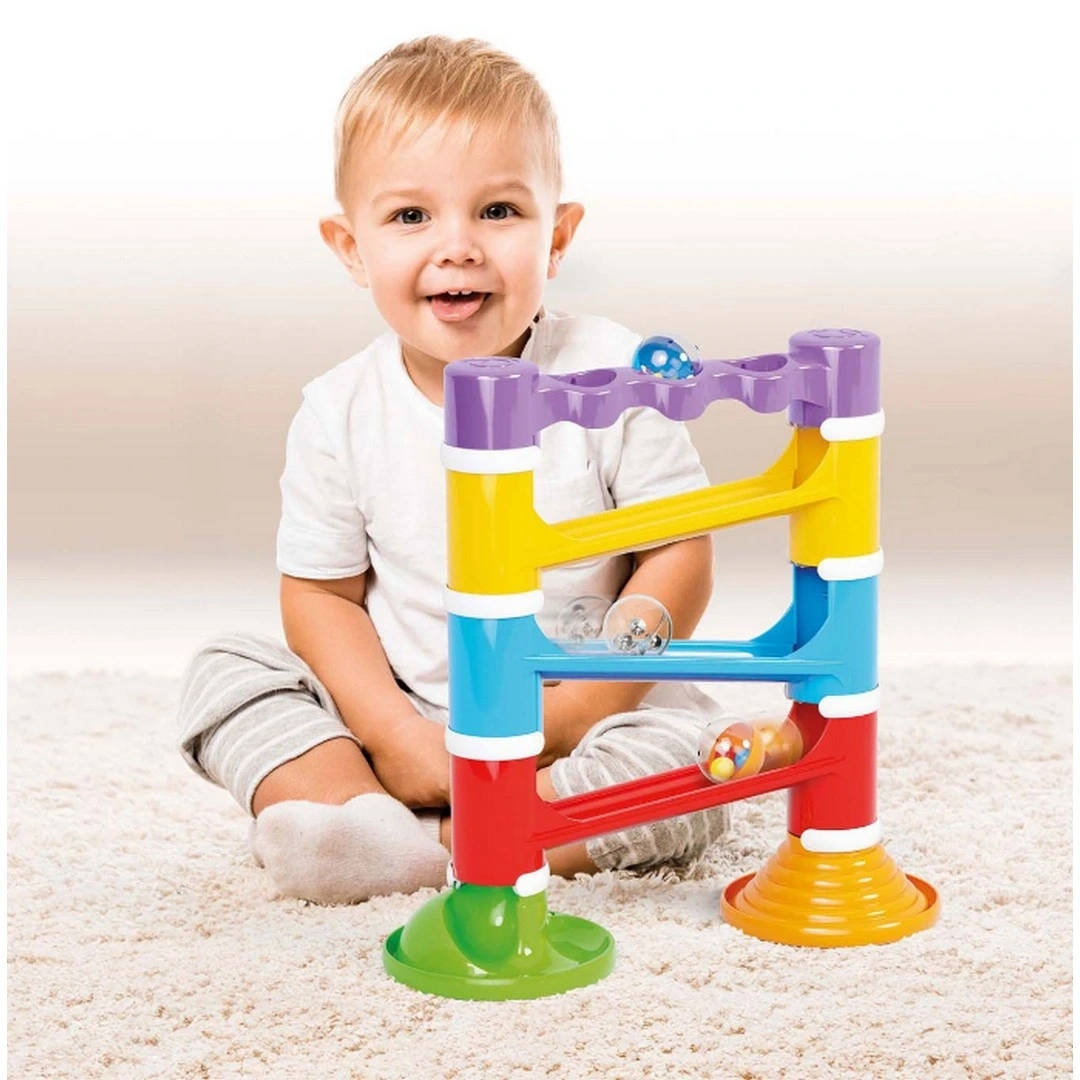 Topları itin ve pistten aşağı yuvarlanırken çıkan eğlenceli sesi dinleyin. Motor becerilerini ve yaratıcı düşünmeyi geliştirmek için