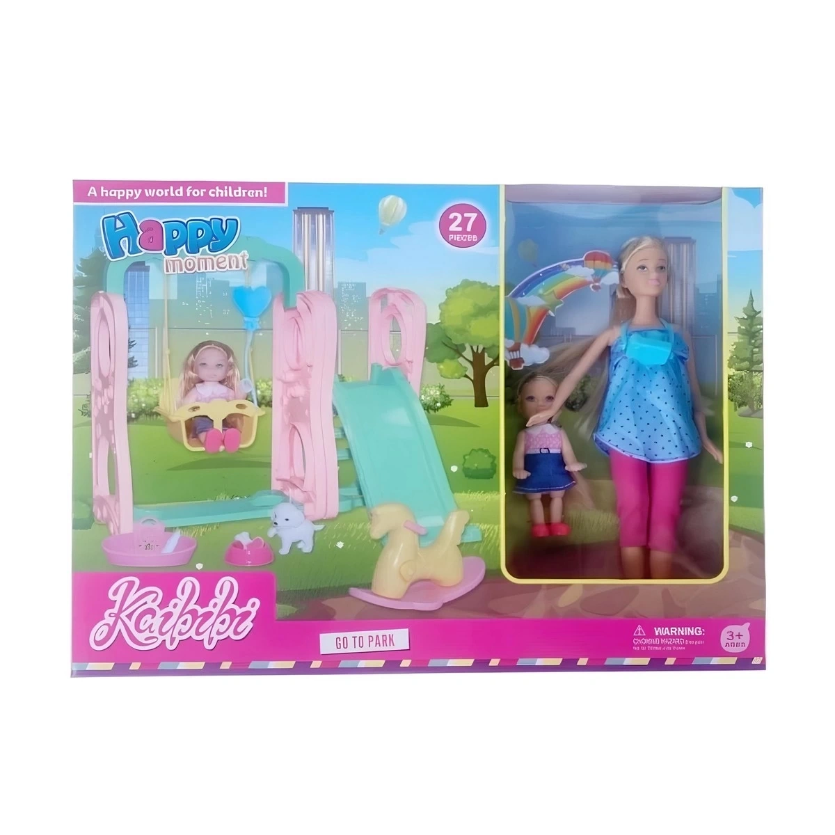 Şık kutusu içinde gelen bu set, sevimli bir bebek ve onun için özel olarak tasarlanmış bir salıncak içerir.