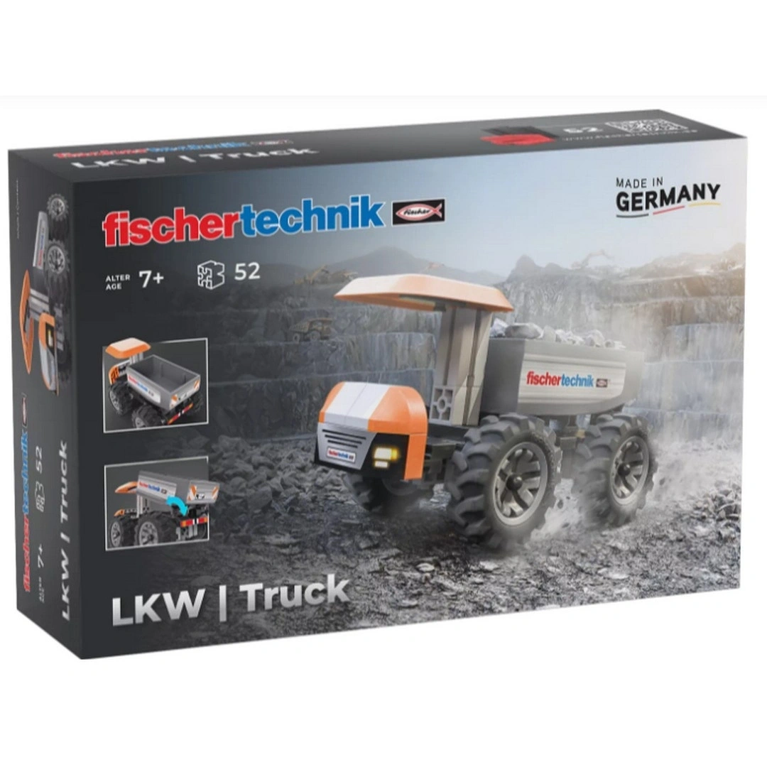 Fischertechnik kamyonu, şantiye operasyonları için güçlü bir araçtır. Devrilebilir yükleme alanı ve sağlam tekerlekleriyle, ağır yükleri