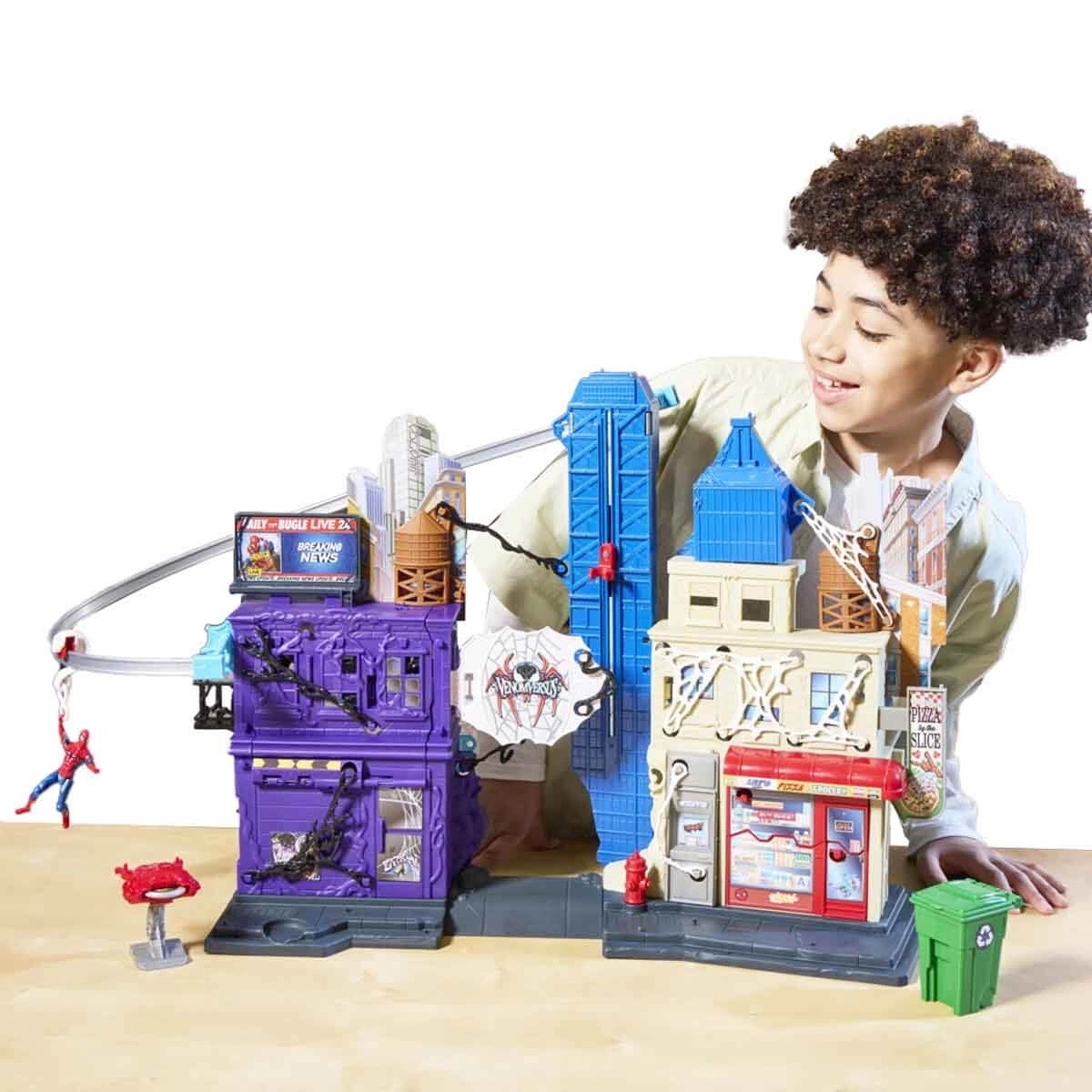 Şehrin her köşesinde dolaşıyor, simbiyotu yakalamak için ağlarıyla ona tuzaklar kuruyor. 30’dan fazla özeliğe sahip şehirde çocuklar Spider-Man figürünü zipline’da kaydırabilir, binaların duvarlarında tırmandırabilir, Venom’u gördüğünde disk fırlatabilir ve onu kanalizasyon boşluğundan kaçarken yakalayabilir. Görev başındayken kameralara yakalanan Örümcek Adam’ın haberlere çıktığını bile görebilirsin. 45 cm’den fazla uzunluğa sahip oyun seti, filmden en sevdiği anları yeniden canlandırmak ya da kendi oluşturduğu hikayeler ile eğlenmek isteyen çocukları bekliyor. Örümcek Adam ve Venom ağları, Marvel hayranı çocukları maceranın içerisinde hissettirecek ve Örümcek Adam şehrin güvenliği için çalışırken 10 cm boyundaki figür hali ile çocuklara eşlik edecektir. Süper kahraman, şehirde devriyede!
