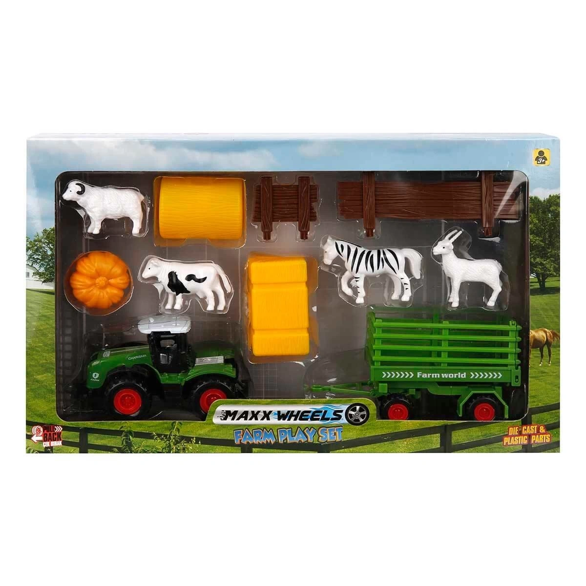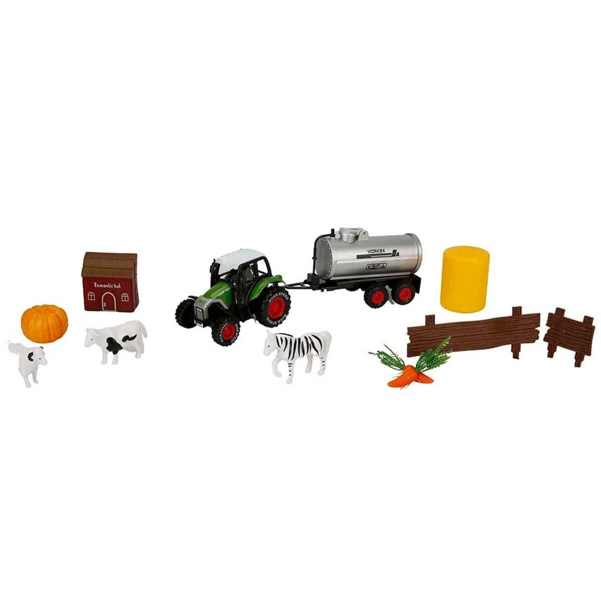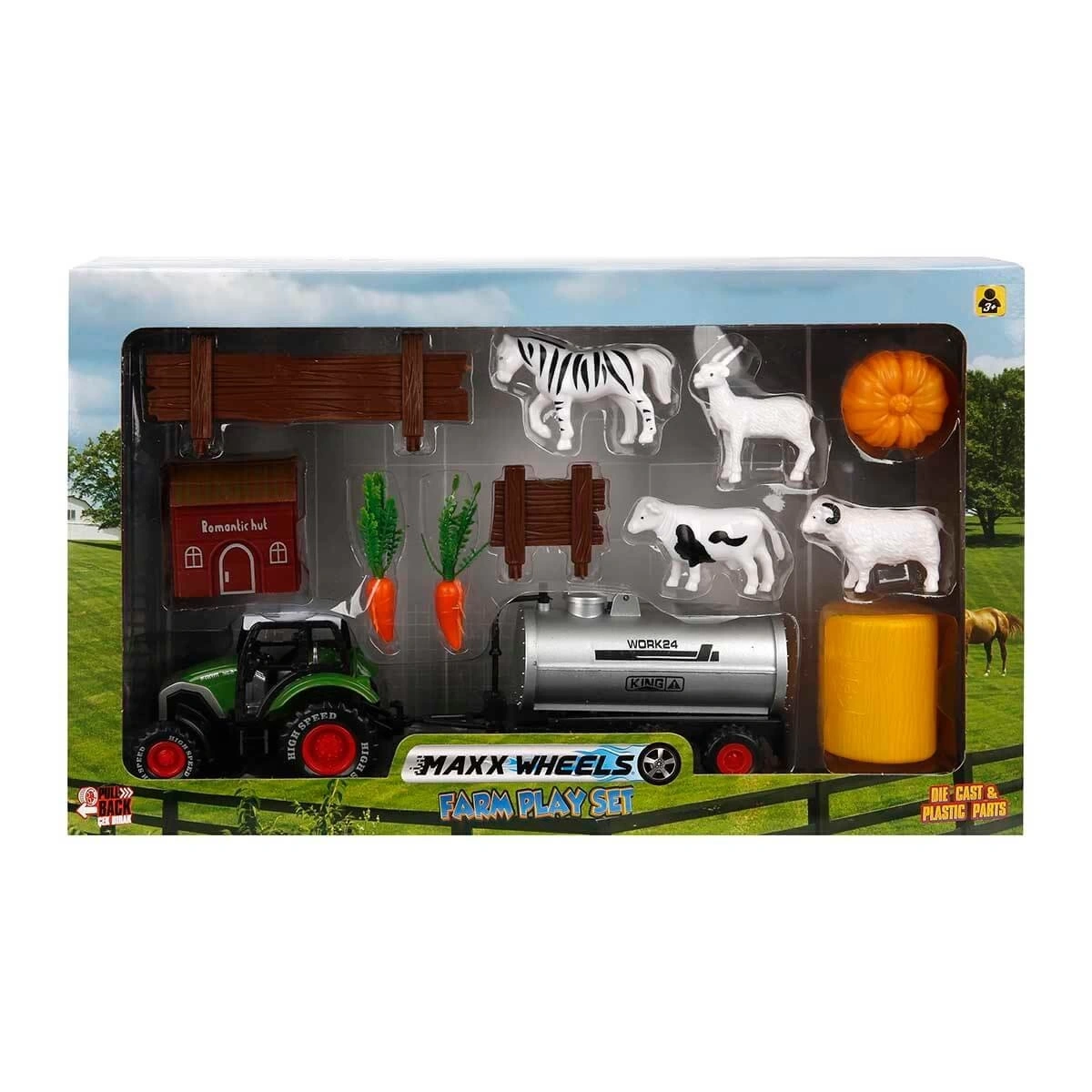 Farklı parça sayılarına sahip bu set içerisinde; traktör, çiftlik hayvanları çitler, çiftlik aksesuarları,