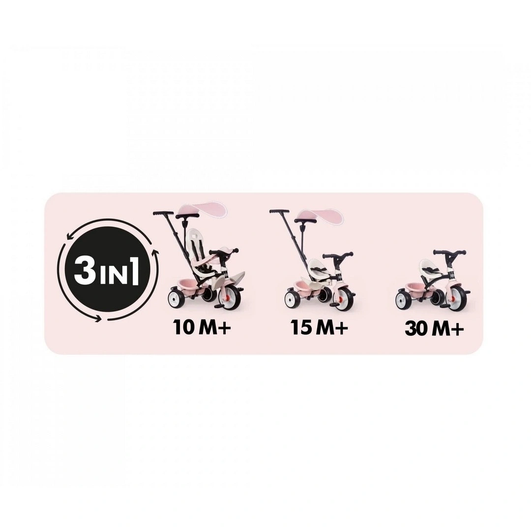 Smoby üç tekerlekli bisiklet, 10 aylıktan 3 yaş üstü çocuklara yönelik 3'ü 1 arada evrimsel bir üç tekerlekli bisiklettir.